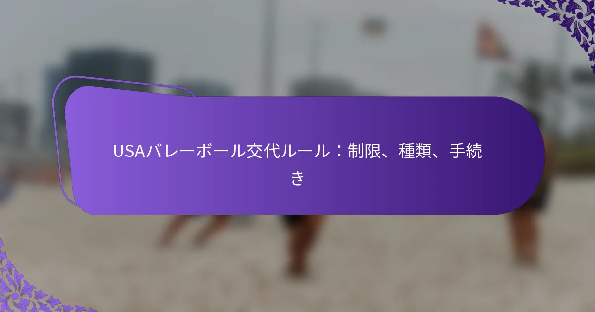 アメリカバレーボールにおいて、交代は試合の流れを維持し、公平なプレーを確保するために重要であり、チームが遵守しなければならない特定の制限があります。通常の交代、戦術的交代、リベロ特有の交代など、さまざまなタイプの交代があり、それぞれにチームのパフォーマンスを向上させるための独自のルールと戦略があります。交代を実行するための定義された手順を理解することは、試合中のスムーズな移行に不可欠です。 アメリカバレーボールにおける交代の制限は何ですか? アメリカバレーボールでは、試合の流れを維持し、公平なプレーを確保するために交代が制限されています。チームは、規制を遵守しながらパフォーマンスを最適化するために、これらのルールを慎重に考慮しなければなりません。 セットごとに許可される最大交代数 アメリカバレーボールでは、各チームはセットごとに最大6回の交代が許可されています。この制限は、戦略的な計画と選手交代のタイミングを慎重に選ぶことを促します。チームは試合のダイナミクスに適応するために、交代を効果的に活用しなければなりません。 コーチは交代のタイミングを考慮する必要があり、待ちすぎるとチームのパフォーマンスを向上させる機会を逃す可能性があります。試合の流れを理解することは、許可された交代を最大限に活用するために重要です。 交代される選手の適格基準 交代の対象となる選手は、公式ロースターに登録されており、チームと良好な関係にある必要があります。交代は、得点後やタイムアウト中など、プレーの中断時にのみ行うことができます。これにより、試合が秩序を保ち、すべての選手が確認されることが保証されます。 さらに、交代された選手は次のセットまで試合に再入場できないため、コーチにとっては戦略のもう一つの層が加わります。選手の疲労とパフォーマンスレベルを管理しながら、これらの適格基準を遵守することが重要です。 交代に関する戦略的制限 戦略的に、コーチは交代がチームの化学反応や勢いに与える影響を考慮しなければなりません。頻繁な交代は試合の流れを乱し、選手の士気に影響を与える可能性があります。したがって、交代は、最も利益をもたらすことができる重要な瞬間に制限することがしばしば推奨されます。 さらに、チームは絶対に必要でない限り、好調な選手を交代させることを避けるべきです。このアプローチは競争力を維持し、試合の重要なポイントで最も効果的なラインアップをコートに置くことを保証します。 不正な交代の結果 不正な交代は、ポイントの喪失やセットの喪失など、重大なペナルティを引き起こす可能性があります。チームが適格でない選手を交代させたり、許可された交代数を超えたりした場合、審判はファウルを宣告することがあります。これはチームの勝利の可能性に深刻な影響を与える可能性があります。 これらの結果を避けるために、チームはすべての交代が公式に適切に伝えられ、選手が自分の適格状況を認識していることを確認する必要があります。明確なコミュニケーションを維持することで、試合中の高額なミスを防ぐことができます。 交代がチームダイナミクスに与える影響 交代はチームダイナミクスに大きな影響を与え、パフォーマンスと士気の両方に影響を与えます。新しい選手を投入することでチームが活性化し、新たなエネルギーを提供できますが、確立された化学反応を乱す可能性もあります。コーチは新しい選手の利点とシナジーの喪失の可能性を天秤にかける必要があります。 さらに、選手が交代にどのように反応するかは異なります。ある選手は自分のポジションを競う挑戦に応じて活躍するかもしれませんが、他の選手は士気を失うかもしれません。個々の選手の心理を理解することは、交代がチーム全体のパフォーマンスに与えるポジティブな影響を最大化するために重要です。 アメリカバレーボールで許可されている交代の種類は何ですか? アメリカバレーボールでは、特定のルールと戦略を持ついくつかの種類の交代が許可されています。これらの交代には、通常の交代、戦術的交代、リベロ特有の交代、怪我や病気による交代が含まれます。これらの種類を理解することで、試合中のチームダイナミクスとパフォーマンスを向上させることができます。 通常の交代とそのルール アメリカバレーボールの通常の交代では、チームがコート上の選手をベンチからの交代選手と交代することが許可されています。各チームはセットごとに限られた数の交代が許可されており、通常はプレーのレベルに応じて6回から12回の範囲です。交代は、適切な手順に従ってプレーの中断時に行うことができます。 交代が行われる際には、交代される選手は交代選手が入る前にコートを離れなければなりません。コーチはチームの勢いとエネルギーレベルを維持するために、選手を交代させるタイミングにつ