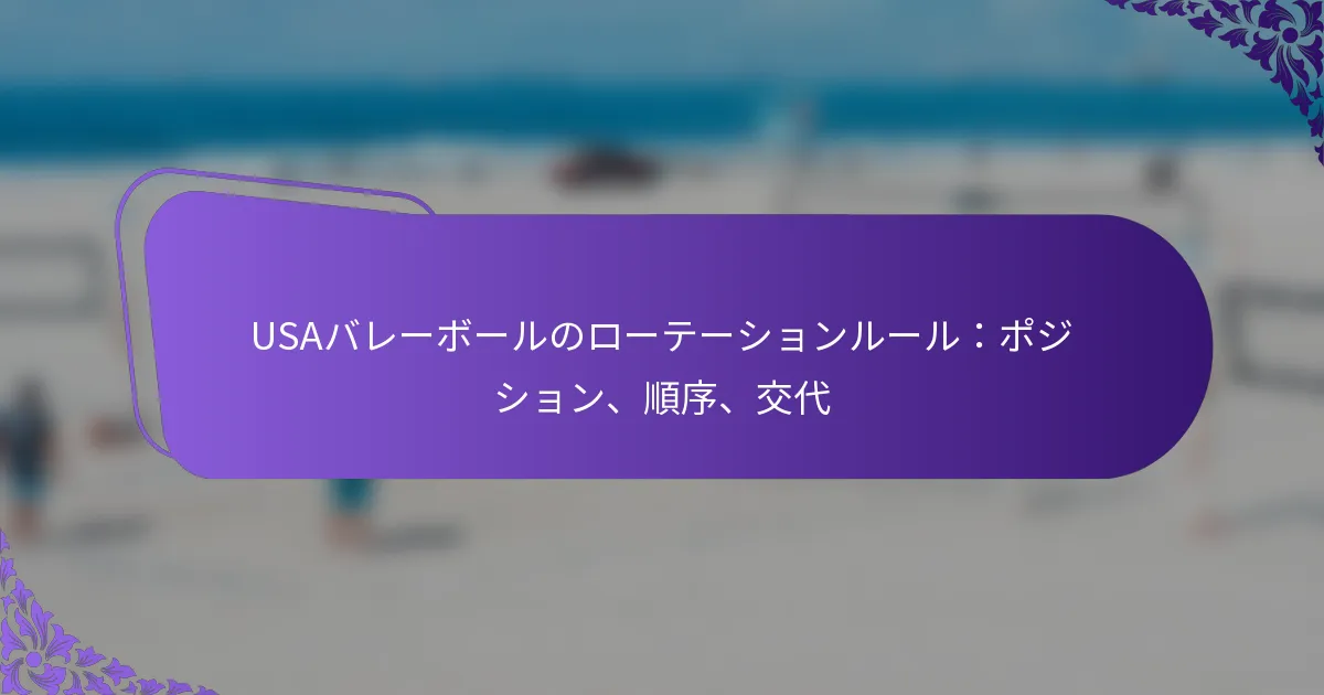 USAバレーボールのローテーションルールは、公正なプレーと戦略的なゲームプレイを維持するために不可欠であり、選手のポジションと各サーブ後のローテーションの順序を決定します。6つの異なる選手ポジションがあるため、これらの役割を理解することは、効果的なチームダイナミクスと成功する試合パフォーマンスにとって重要です。確立されたローテーション順序を遵守することで、チームは試合を通じてスムーズかつ効率的に運営されます。 USAバレーボールのローテーションルールとは? USAバレーボールのローテーションルールは、選手がコート上でどのようにポジショニングを行い、各サーブ後にどの順序でローテーションするかを決定します。これらのルールは、チームが特定のフォーメーションを維持し、交代ガイドラインに従うことを要求することで、公正なプレーと戦略的なゲームプレイを確保します。 ローテーションルールの定義と目的 バレーボールのローテーションルールは、各サーブの前後に選手がコート上でどのように整列するかを定義します。各チームは6人の選手で構成され、サーブを獲得した際には時計回りにポジションをローテーションしなければなりません。このシステムはチームワークを促進し、すべての選手が攻撃と防御のプレーに参加することを保証します。 これらのルールの主な目的は、試合中の秩序を維持し、選手が有利なポジションを長時間占有することによって生じる不公平な利点を防ぐことです。構造化されたローテーションを強制することで、試合は競争的でダイナミックなものになります。 ゲームプレイにおけるローテーションの重要性 ローテーションはバレーボールにおいて非常に重要であり、攻撃と防御の戦略の両方に影響を与えます。適切なローテーションは、選手が指定されたポジションにいることを保証し、プレー中の効果的なコミュニケーションと調整を可能にします。この組織化は、チームが強みを最大化し、弱点をカバーするのに役立ちます。 さらに、ローテーションを理解することで、チーム全体のパフォーマンスに影響を与えることができます。各ローテーションにおける自分の役割と責任を理解している選手は、プレーをより良く予測でき、実行力とチームワークが向上します。適切にローテーションされたチームは、ラリーを維持し、得点を獲得するのにしばしば成功します。 ローテーションメカニクスの概要 USAバレーボールでは、選手はチームが相手チームからサーブを獲得するたびにローテーションを行わなければなりません。バックライトポジションの選手がサーブを行い、サーブ後に選手は1つのポジションを時計回りに移動します。つまり、前ライトにいた選手はバックライトに移動し、その後も同様です。 各選手はプレー中に指定されたポジションを遵守しなければならず、これにはフロントローとバックローの役割が含まれます。フロントローの選手は攻撃とブロックを担当し、バックローの選手は防御とプレーのセットアップに焦点を当てます。これらのメカニクスを理解することは、効果的なゲームプレイにとって不可欠です。 USAバレーボールの主要規則 USAバレーボールの規則は、チームが試合中にローテーション順序を維持しなければならないことを明記しています。チームが正しくローテーションしない場合、ポイントペナルティやサーブの喪失が生じる可能性があります。交代も規制されており、通常は1セットあたり約6回の交代が許可されています。 選手は、スムーズな移行を確保するために、通常はバックラインの中央で特定の場所からコートに入退場しなければなりません。この規則は、ゲームの流れを維持し、交代中の混乱を防ぐのに役立ちます。 ローテーションルールに関する一般的な誤解 一般的な誤解の1つは、選手が試合中に自由にポジションを変更できるということです。実際には、選手は確立されたローテーション順序に従わなければならず、逸脱があるとペナルティが科される可能性があります。もう1つの誤解は、サーバーだけがローテーションしなければならないということです。すべての選手はユニットとして一緒にローテーションしなければなりません。 一部の選手は、ローテーションルールは初心者にのみ関連していると考えていますが、これはすべてのレベルのプレーにとって基本的なものです。これらのルールを理解することは、戦略の開発と試合中の公式規則の遵守のために不可欠です。 USAバレーボールのローテーションに関与するポジションはどれですか? USAバレーボールでは、ローテーションにはコート上の6つの選手ポジションが関与しており、それぞれがチーム全体の戦略に貢献する特定の役割を持っています。これらのポジションを理解することは、効果的なゲームプレイと試合中の成功するローテーションにとって重要です。 各ポジションの役割と責任 バレーボールの6