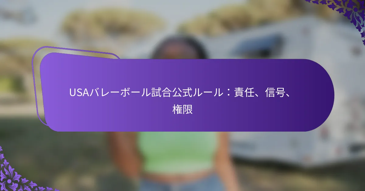 アメリカのバレーボールの試合審判は、すべての行動が確立されたルールに従うことを保証することで、試合の誠実さと公正さを維持する重要な役割を果たします。彼らは試合の管理、選手の行動の監視、試合の結果に影響を与える重要な決定を下す責任があります。標準化された一連の手信号を通じて、審判は選手、コーチ、観客に対して自らの判定を明確に伝え、透明性と理解のある環境を育んでいます。 アメリカのバレーボールの試合審判の責任は何ですか? アメリカのバレーボールの試合審判は、試合が公正に行われ、確立されたルールに従っていることを保証する責任があります。彼らの役割には、試合の管理、選手の行動の監視、試合の誠実さの維持が含まれます。 試合管理における審判の役割 審判はバレーボールの試合における主要な審判であり、ルールを施行し、重要な決定を下す責任があります。彼らは試合全体を監督し、選手やコーチの行動を含め、試合が円滑に進行するようにします。 プレイ中、審判はファウル、ポイント、タイムアウトなどのさまざまなイベントを合図します。彼らは試合に対して警戒し、注意を払い、結果に影響を与える可能性のある迅速な決定を下さなければなりません。彼らの権限は最終的なものであり、選手は彼らの判定を尊重しなければなりません。 審判はまた、ラインジャッジやスコアキーパーとコミュニケーションを取り、試合の状況について全員が一致していることを確認します。この調整は誤解を防ぎ、試合の流れを維持するのに役立ちます。 プレイ中のラインジャッジの義務 ラインジャッジは、コートの境界を監視し、ボールがプレイ中かアウトかを合図することで審判を支援します。彼らはコートの角に位置し、ラインを明確に見ることができます。 各ラインジャッジは特定のラインに責任を持ち、集中して注意を払う必要があります。彼らは旗を使って自らの判定を示し、それは審判や選手に対して明確で見やすいものでなければなりません。 ラインジャッジは、正確な判定を下すためにゲームのルールに精通している必要があります。彼らの役割は、審判の決定を支持し、試合の誠実さを維持する上で重要です。 スコアキーパーと補助審判の義務 スコアキーパーは、試合中のスコア、交代、タイムアウトを追跡する責任があります。彼らは試合の正確な記録を維持し、これは公式の文書や統計にとって不可欠です。 補助審判には、試合のレベルに応じてセカンドレフェリーやリベロトラッカーが含まれる場合があります。彼らの義務には、選手のローテーションを監視し、交代ルールの遵守を確保することが含まれることがあります。 スコアキーパーと補助審判の間の効果的なコミュニケーションは重要です。彼らはすべての試合の側面が正確に記録され、報告されるように、審判と密接に連携する必要があります。 選手の行動と紛争の管理 試合審判は、選手の行動を管理し、敬意を持った競争的な環境を確保する責任があります。彼らは、スポーツマンシップに反する行動に迅速かつ効果的に対処しなければなりません。 紛争が発生した場合、審判は介入し、最終的な決定を下す権限を持っています。彼らは選手やコーチに対して自らの判定を明確に説明し、緊張を和らげるのに役立ちます。 審判は中立的で冷静であり続け、試合全体を通じてプロフェッショナルなトーンを設定する必要があります。このアプローチは、彼らの権威に対する尊敬を促し、試合の誠実さを維持するのに役立ちます。 公式ルールの遵守を確保する 試合審判は、すべての選手とコーチが公式のバレーボールルールに従うことを保証する責任があります。これには、機器の監視、選手の適格性、ゲームプロトコルの遵守が含まれます。 審判は、現在のルールや更新に精通している必要があり、公正なプレイを確保します。定期的なトレーニングとルールの見直しは、彼らの知識と効果を維持するのに役立ちます。 遵守を強制することで、審判は試合の誠実さを守るだけでなく、スポーツ全体の発展にも貢献します。彼らの役割は、すべてのレベルのプレイにおいて公正な競争とスポーツマンシップを促進する上で不可欠です。 アメリカのバレーボールの試合審判はどのような合図を使用しますか? アメリカのバレーボールの試合審判は、得点、ファウル、その他の試合イベントに関する決定を伝えるために、標準化された一連の手信号を使用します。これらの合図は、試合中の明確さと一貫性を確保し、選手、コーチ、観客が審判の判定を効果的に理解できるようにします。 得点決定のための一般的な手信号 得点の合図は、どのチームがポイントを獲得したかを示すために重要です。最も一般的な合図は、片方の腕を頭上に上げて開いた手を示すことで、これはサーブチームにポイントを示します。逆に、閉じた拳は受けるチームに与えられたポイントを示します。 審判は、混