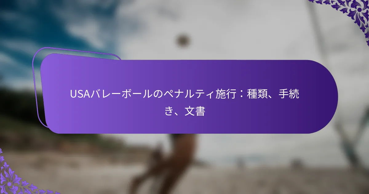 USAバレーボールは、試合中の公正なプレーとスポーツマンシップを維持するために、さまざまな罰則を適用し、ルール違反、選手の不正行為、手続き上のエラーに対処しています。施行プロセスには、違反を評価する審判、決定を伝えること、試合の整合性を維持するために事件を文書化することが含まれます。正確な文書化は重要であり、透明性と説明責任を確保し、チームや選手に大きな影響を与えます。 USAバレーボールの罰則の種類は何ですか? USAバレーボールは、試合中の公正なプレーとスポーツマンシップを維持するために、いくつかの種類の罰則を適用します。これらの罰則は、ルール違反、選手の不正行為、手続き上のエラー、ゲーム管理の問題に対処し、それぞれ特定の結果と施行手続きがあります。 ルール違反に関連する違反 USAバレーボールにおけるルール違反には、ネット違反、フットファール、不適切なローテーションなどの行為が含まれます。これらの違反は通常、対戦相手にポイントペナルティが与えられます。選手やコーチが不必要な罰則を避けるためには、特定のルールと一般的な違反を理解することが重要です。 一般的なルール違反には以下が含まれます: ネット違反:プレー中にネットに触れること。 フットファール:サーブ中にサービスラインを越えること。 ローテーションエラー:サーブ前に正しくローテーションしないこと。 これらの違反はすべてラリーとポイントの喪失につながり、試合全体の結果に影響を与えます。コーチは、これらの罰則を最小限に抑えるために、練習中にルールの遵守を強調すべきです。 選手の行動に対する不正行為の罰則 不正行為の罰則は、審判に対する口論、スポーツマンシップに反する行動、または侮辱的な言葉など、選手による不適切な行動に対処します。これらの罰則は、行動の深刻度に応じて警告、ポイントの減点、または試合からの失格につながる可能性があります。 不正行為の罰則の種類には以下が含まれます: イエローカード:軽微な違反に対する警告。 レッドカード:対戦相手にポイントペナルティが与えられる。 失格:深刻または繰り返しの不正行為。 選手は、冷静さを保ち、審判や対戦相手に対して敬意を持つことが、これらの罰則を避けるために重要であることを認識すべきです。これらの罰則は、チームの士気やパフォーマンスに大きな影響を与える可能性があります。 手続き上のエラーとその結果 手続き上のエラーは、チームが確立されたプロトコルに従わない場合に発生します。例えば、不適切な交代や、選手交代の変更を審判に通知しないことなどです。これらのエラーは、サーブやポイントの喪失など、チームに不利な罰則につながる可能性があります。 一般的な手続き上のエラーには以下が含まれます: 不適切な交代:正しい交代プロセスに従わないこと。 審判への通知の失敗:選手交代の変更を事前に審判に知らせないこと。 手続き上のエラーを最小限に抑えるために、チームは明確なコミュニケーションプロトコルを確立し、すべての選手が交代やラインアップに関するルールに精通していることを確認する必要があります。 ゲーム管理の罰則 ゲーム管理の罰則は、試合の進行に関連する違反に対してコーチやチームに発行されることが一般的です。例えば、試合の遅延や時間制限の遵守を怠ることなどです。これらの罰則は試合の流れを妨げ、ポイントの減点につながる可能性があります。 ゲーム管理の罰則の例には以下が含まれます: ゲームの遅延:不必要な中断を引き起こすこと。 タイムアウトの遵守の失敗:タイムアウトに関する規則を守らないこと。 コーチは、チームがタイムリーなプレーの重要性とゲーム管理ルールの遵守を理解するように努め、これらの罰則を避けるべきです。 罰則の重さの比較 罰則の種類 重さのレベル 典型的な結果 ルール違反 中程度 対戦相手にポイントが与えられる 不正行為の罰則 高い ポイントの減点または失格 手続き上のエラー 低から中程度 サーブやポイントの喪失 ゲーム管理の罰則 中程度から高い ポイントの減点またはゲームの遅延 さまざまな罰則の重さを理解することで、チームは最も影響の大きい違反を防ぐことに重点を置くことができます。コーチは、試合中の意識と遵守を高めるために、選手と定期的にこれらの罰則を見直すべきです。 USAバレーボールにおける罰則はどのように施行されますか? USAバレーボールにおける罰則は、公正なプレーとルールの遵守を確保するための構造化されたプロセスを通じて施行されます。審判は違反を評価し、決定を伝え、試合の整合性を維持するために事件を文書化します。 試合中の罰則評価のステップ プレーのルールに基づいて違反を特定する。 必要に応じて他の審判と相談し、違反を確認する。 違反の重さに基づいて適切な罰則の種類を決定する。 関係者に罰則を明確かつ迅速に伝える。 将来の参考と説明責任のために事