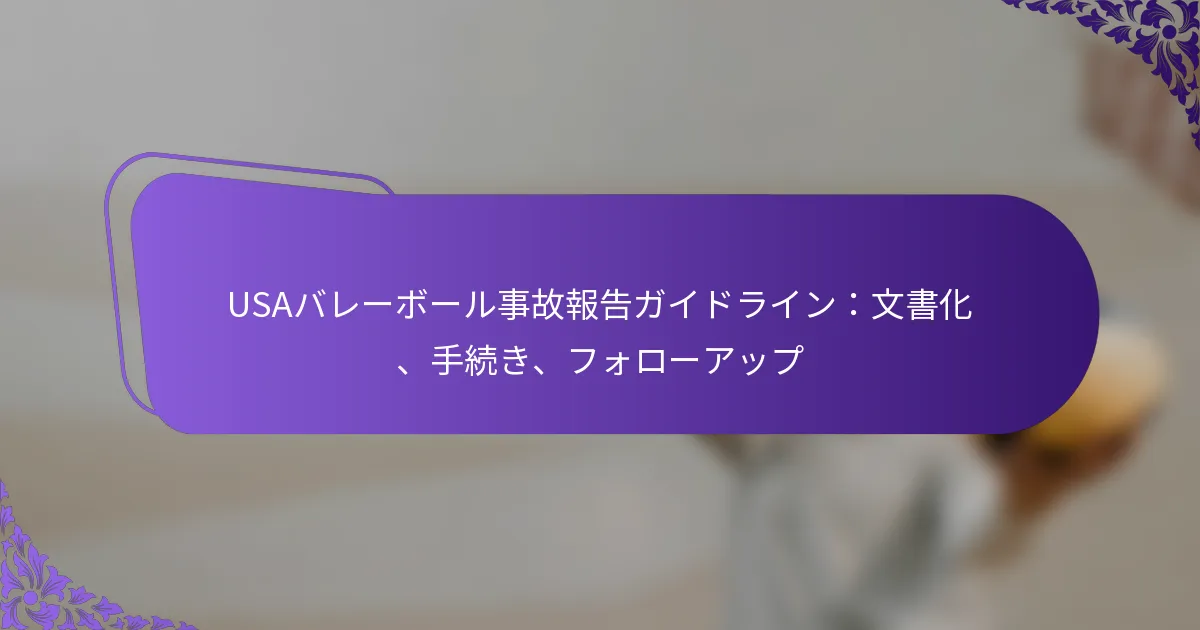 USAバレーボールの事故報告ガイドラインは、スポーツ内での事故を文書化し対処するための明確な枠組みを確立し、安全性と責任を促進します。これらの手順に従うことで、個人は事故が正確に報告され、適切に処理されることを確保し、すべての参加者にとって安全な環境を育むことができます。 USAバレーボールの事故報告ガイドラインとは何ですか? USAバレーボールの事故報告ガイドラインは、スポーツ内で発生する事故を文書化し対処するための構造化されたアプローチを提供します。これらのガイドラインは、安全性、責任、および規制の遵守を確保するために不可欠であり、すべての参加者にとって安全な環境を作り出す手助けをします。 バレーボールにおける事故報告の定義 バレーボールにおける事故報告とは、選手、コーチ、審判、または観客の安全や福祉にリスクをもたらすイベントを文書化する体系的なプロセスを指します。これには、怪我、不正行為、または練習や競技中の異常な出来事が含まれる場合があります。適切な文書化は、事故を分析し、将来の発生を防ぐために重要です。 報告は明確かつ簡潔であるべきで、事故の性質、関与した個人、および取られた即時の行動を詳細に記述する必要があります。これにより、すべての関連情報がレビューおよびフォローアップのために記録されます。 ガイドラインを遵守する重要性 USAバレーボールの事故報告ガイドラインを遵守することは、安全なスポーツ環境を維持するために重要です。これらのガイドラインは、組織が事故に効果的に対応できるようにし、参加者を保護するために適切な措置が講じられることを保証します。遵守はまた、アスリート、親、審判の間に信頼を育みます。 これらのガイドラインに従わないと、事故に対する不十分な対応につながり、さらなる危害や責任問題を引き起こす可能性があります。遵守を優先する組織は、安全性と責任に対するコミットメントを示しています。 USAバレーボールの報告フレームワークの概要 USAバレーボールの報告フレームワークは、事故を報告するための手順を初期文書化からフォローアップ行動まで概説しています。通常、次の段階が含まれます:事故の特定、即時の対応、文書化、報告の提出、およびレビュー。 報告は、指定された期間内に指定された公式または委員会に提出されるべきであり、通常は事故発生から24〜48時間以内です。この迅速な報告により、タイムリーな調査と解決が可能になります。 事故報告に関与する主要な利害関係者 USAバレーボールの事故報告プロセスには、いくつかの主要な利害関係者が関与しています。これには以下が含まれます: コーチ:自分のチームに関する事故を報告する責任があります。 審判:競技中に観察した事故を文書化する必要があります。 イベント主催者:適切な報告プロトコルが整備されていることを確認しなければなりません。 参加者:目撃または経験した事故を報告することが奨励されます。 USAバレーボール管理部門:事故報告の実施とレビューを監督します。 報告が必要な一般的な事故の種類 USAバレーボールのガイドラインに基づいて報告が必要なさまざまな事故があります。一般的な種類には以下が含まれます: 怪我:練習や試合中に選手や審判が受けた身体的な損傷。 不正行為:イベントを妨害する選手、コーチ、または観客による受け入れられない行動。 機器の故障:安全リスクをもたらす可能性のあるバレーボール、ネット、またはその他の機器の問題。 環境の危険:事故を引き起こす可能性のある濡れた床や不十分な照明などの条件。 これらの事故のそれぞれは、適切な対応と将来の予防策を促進するために徹底的に文書化されるべきです。 事故報告に必要な文書は何ですか? USAバレーボールでの事故報告には、適切な処理とフォローアップを確保するために特定の文書が必要です。この文書は、安全性、責任、および規制の遵守を維持するのに役立ちます。 事故報告に必要な基本的なフォーム 事故を効果的に報告するためには、いくつかの基本的なフォームを記入する必要があります。これには通常、イベントの詳細を記録する事故報告書と、怪我が関与する場合の関連する医療リリースフォームが含まれます。さらに、目撃者の証言を収集するために目撃者声明フォームが必要になる場合があります。 すべてのフォームが正確に記入され、迅速に提出されることを確認することが重要です。これにより、タイムリーな調査と解決が促進されます。各フォームは特定の目的を持ち、事故の包括的な理解に寄与します。 事故報告に含めるべき詳細 事故報告には、事故の発生日時、場所、関与した人々の名前と連絡先情報などの重要な詳細を含めるべきです。事故後に取られた行動を含む、何が起こったのかの明確な説明が不可欠です。 さらに、受けた怪我や提供された対応(例:施された応急処置)を文書化することも重要です。この情報