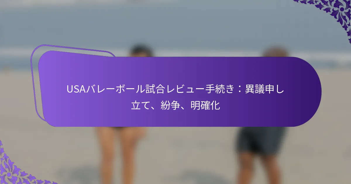 USAバレーボールの試合レビュー手続きは、競技中に発生する可能性のある異議申し立て、紛争、明確化を処理するための明確な枠組みを提供します。これらの手続きは、決定に対して正式に異議を申し立てる手順を概説することで、公平性と誠実性を促進し、関係者が現場で効率的かつ効果的に問題を解決できるようにします。 USAバレーボールの試合レビュー手続きとは何ですか? USAバレーボールの試合レビュー手続きは、競技中の異議申し立て、紛争、明確化に対処するための手順を概説しています。これらの手続きは、公平なプレーを確保し、試合中に発生する問題を関係者が解決するための構造化された方法を提供します。 試合レビュープロセスの概要 試合レビュープロセスは、チームまたは個人が試合中の特定の出来事に関してレビューのリクエストを提出することから始まります。このリクエストは迅速に行われる必要があり、通常は出来事が発生した後の指定された時間内に行われます。 リクエストが提出されると、レビュー委員会は試合の映像や審判の報告を含む利用可能な証拠に基づいて状況を評価します。委員会の目標は、異議申し立てに関して公平で情報に基づいた決定を下すことです。 レビュー後、委員会は関係者にその結果と決定を伝え、プロセス全体の透明性を確保します。 レビューに関与する主要な関係者 試合レビュープロセスには、いくつかの主要な関係者が関与しています。具体的には: チーム: 試合に関与するチームは、異議申し立てや紛争を提出する権利があります。 審判: 試合の公式は、レビュー委員会の決定に情報を提供する重要な洞察と報告を行います。 レビュー委員会: 経験豊富な公式や管理者で構成されることが多いこのグループは、異議申し立てを評価し、最終決定を下します。 各関係者は、レビュープロセスの誠実性と公平性に貢献する特定の役割を持っています。 試合レビュー決定のタイムライン 試合レビュープロセスにおける決定のタイムラインは、通常、迅速な解決を確保するために構成されています。初期のレビューリクエストは、通常、出来事の数分後に提出されるべきです。 レビュー委員会は、通常、ケースの複雑さや証拠の利用可能性に応じて、数時間以内に決定を提供することを目指します。この迅速さは、トーナメントの流れを維持し、混乱を最小限に抑えるのに役立ちます。 場合によっては、特に複雑な紛争には徹底的な調査のために追加の時間が必要になることがありますが、関係者にはプロセス全体を通じて情報が提供されます。 必要な公式文書 試合レビューを開始するには、異議申し立てを支持するための特定の文書が必要です。これには通常、以下が含まれます: 書面によるリクエスト: 異議申し立ての内容を概説した正式な書面によるリクエスト。 証拠: 主張を裏付けるための利用可能な映像や審判の報告。 チームの署名: リクエストを有効にするために、チームの代表者によって文書に署名が必要な場合があります。 完全で正確な文書を持つことは、スムーズなレビュープロセスにとって重要であり、好意的な結果の可能性を高めます。 問い合わせのための連絡先 試合レビュー手続きに関する質問がある場合、関係者はUSAバレーボール内の指定された連絡先に連絡できます。これには通常、以下が含まれます: 公式コーディネーター: 試合の公式を監督する責任があり、審判に関する問い合わせに対する洞察を提供できます。 競技マネージャー: トーナメント全体の運営を担当し、手続きに関する質問を支援できます。 法務部門: レビュープロセスに関連する法的な懸念や明確化に対処します。 これらの役割の連絡先情報は通常、USAバレーボールのウェブサイトに掲載されており、チームや公式が簡単にアクセスできるようになっています。 USAバレーボールで異議申し立てを行うには? USAバレーボールで異議申し立てを行うことは、試合中に下された決定に正式に異議を申し立てることを含みます。このプロセスは、公平性を確保し、競技中に発生する可能性のある紛争に対処するために不可欠です。 異議申し立ての根拠 USAバレーボールで異議申し立てを行うための有効な理由はいくつかあります。これらの根拠を理解することで、参加者は自分の状況が異議申し立てに値するかどうかを判断できます。 ルールや規則の誤適用 公式による不正確な判断 試合運営中の手続き上のエラー 結果に影響を与える可能性のある新しい証拠 異議申し立てを提出するためのステップバイステッププロセス 異議申し立てを提出するには、考慮されるように構造化されたプロセスに従う必要があります。以下の手順に従ってください: 異議を申し立てたい具体的な決定を特定します。 試合の映像や証人の証言など、支持する証拠を集めます。 USAバレーボールが提供する公式な異議申し立てフォームに記入します。 異議申し立てフォームと証拠を指定された権限